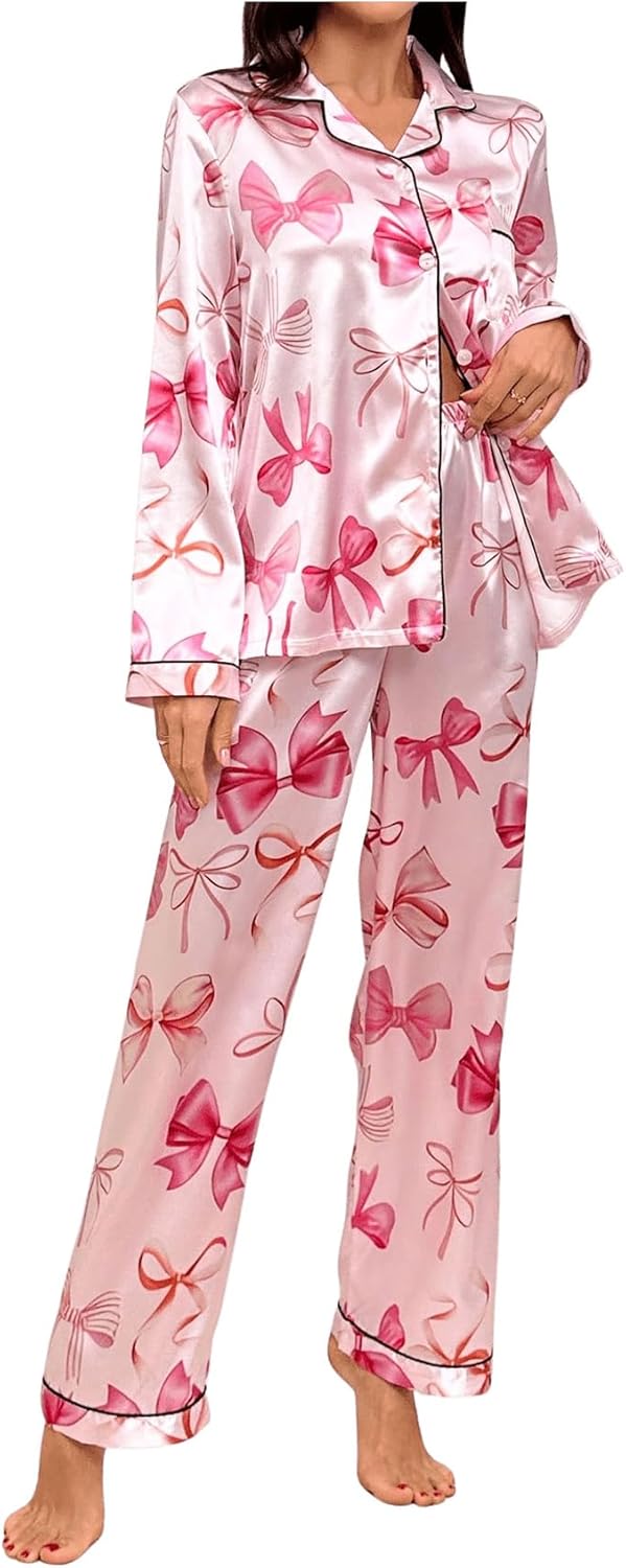 Verdusa Women's Silk Pajamas 2 Piece Satin Cute Bow Long Sleeve Button Down Shirt and Pants Lounge Set