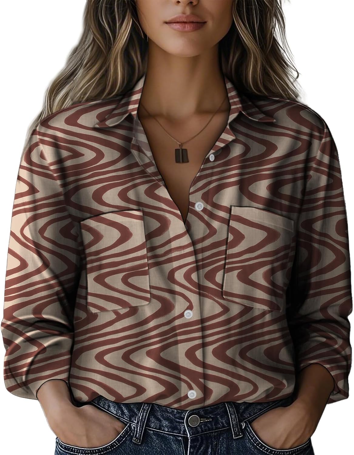 Shirts for Women Trendy Hippie Minimalist Print Tunic Tops Long Sleeve V Neck Button Down Flowing Blouse
