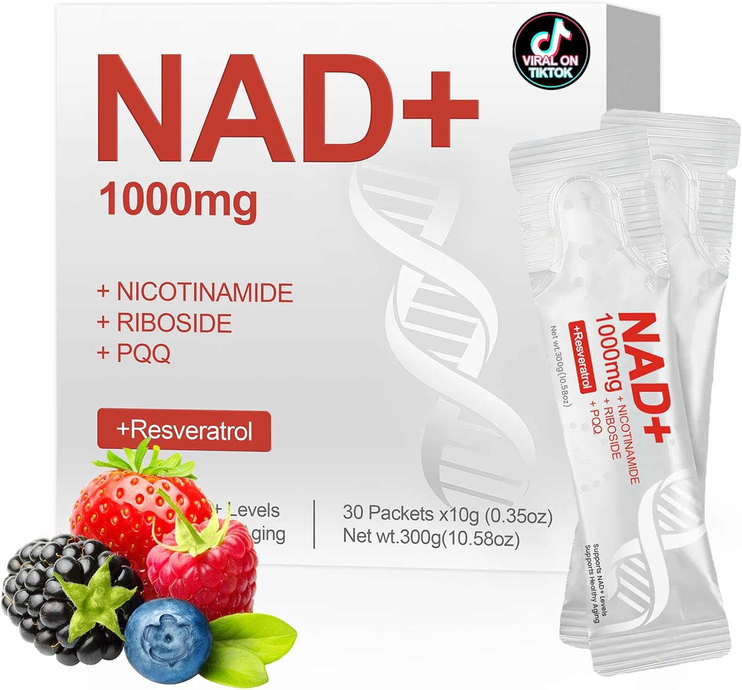 NAD+ Liquid Supplement 1000mg, Premium Nicotinamide Riboside & Resveratrol with PQQ, Advanced NAD Supplement for Men & Women, Natural NAD+ Stick for Anti-Aging, Energy, Focus, Berry Flavor– 30 Packs