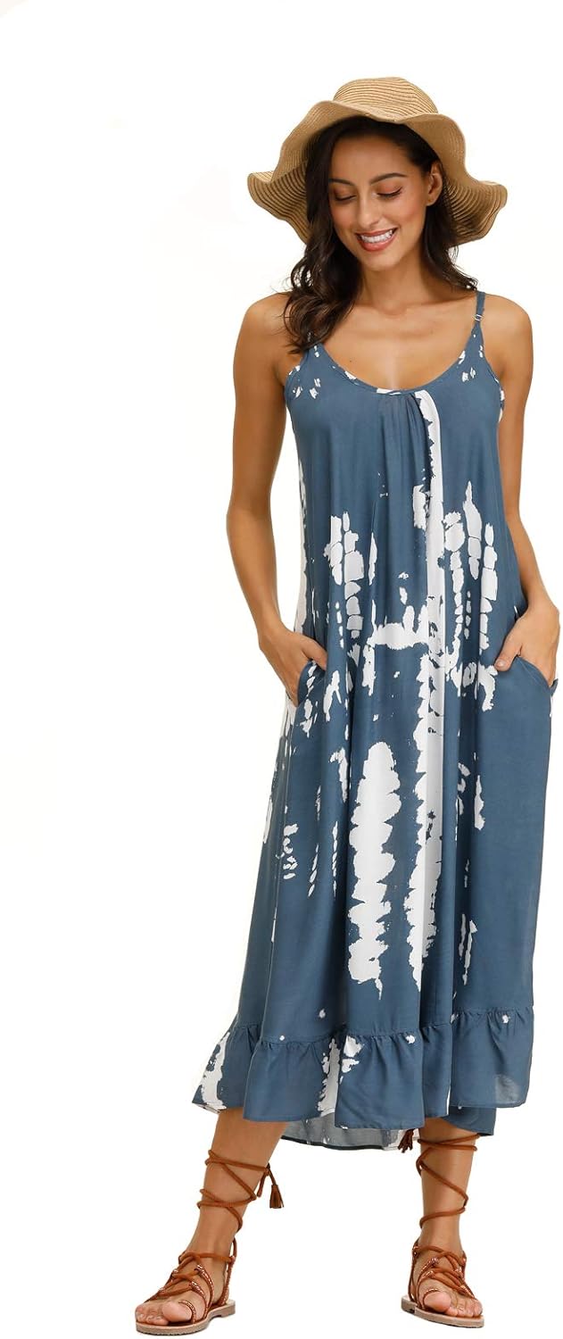 wexcen Women's V-Neck Floral Print Spaghetti Strap Boho Beach Long Maxi Summer Casual Dress with Pockets