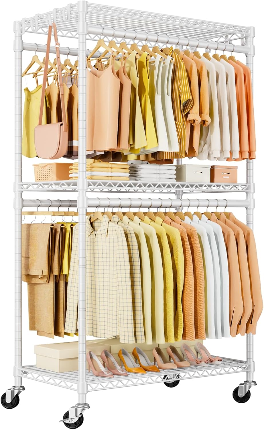 - Space-Saving Double Rod Design: The up-and-down distributed design maximizes vertical space, with a unique double-rod structure that provides extra capacity. The 20.5-inch spacing offers enough width to prevent two rows of clothes from touching. This closet rack offers ample storage for clothing and accessories while optimizing space