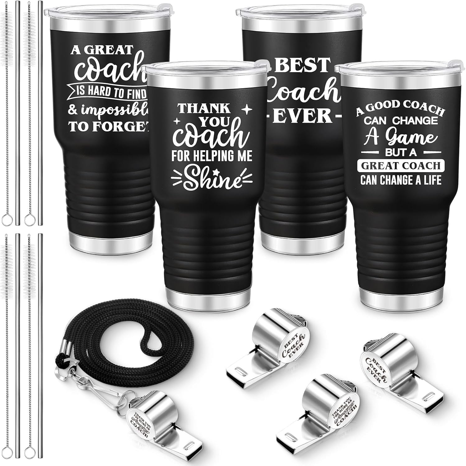 - Nice Combination: thank you coach gift set includes 4 pieces of coach tumblers with straws, lids and brushes, and 4 pieces of coach whistles with lanyards, enough quantity and nice combination make them nice gift for coaches and sports teacher in your school or team