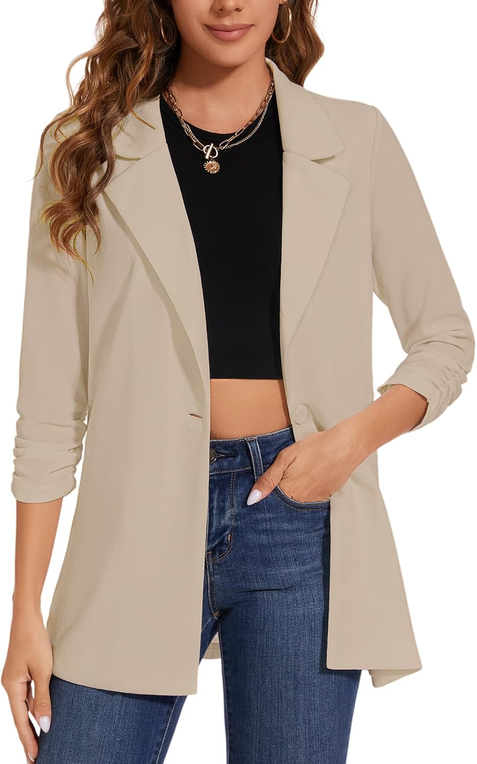 Women's Long Blazer Jackets Button Front Lapel Ruched 3/4 Sleeve Business Casual Office Work Lightweight Blazers