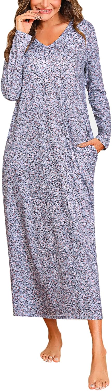 Marvmys Women Cotton Long Nightgowns Long Sleeves Nightshirts V Neck Full Length Sleep Shirts with Pocket