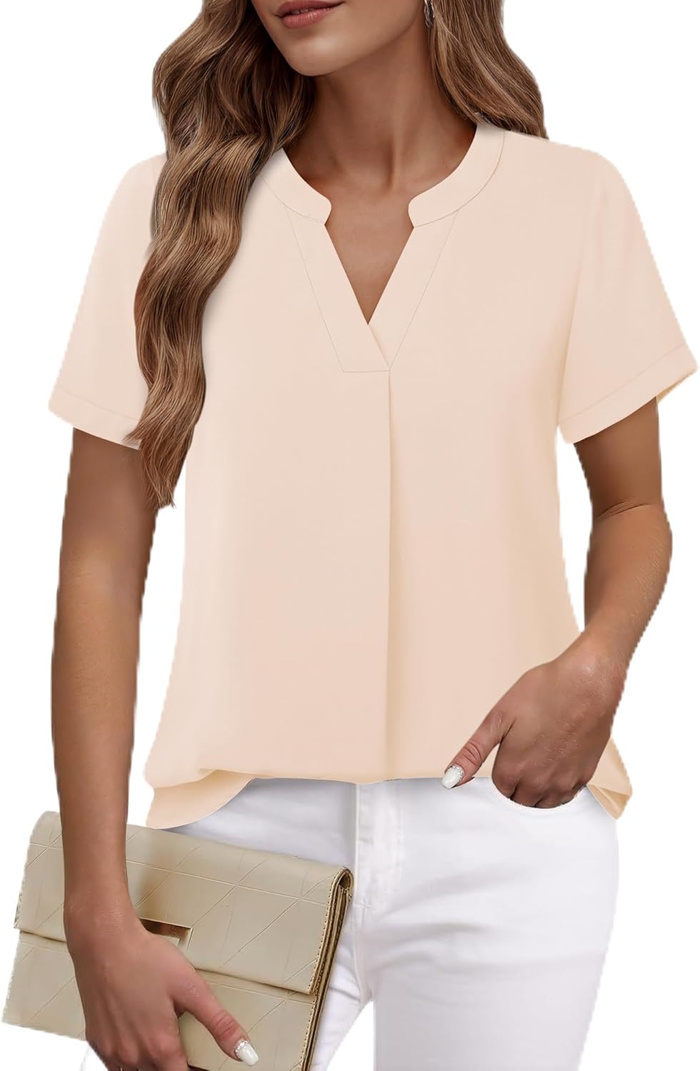 Timeson Women Formal Blouses: Womens V Neck Chiffon Blouse for Work Summer Ladies Dressy Shirts Short Sleeve Tunics for Leggings Plus Size Business Attire Casual Office Wear Professional Beige Tops