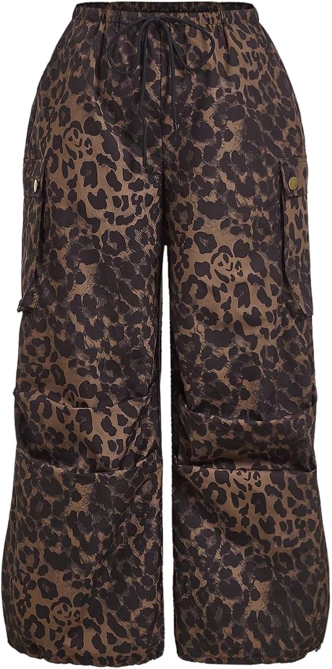 Verdusa Women's Plus Size Leopard Print Cargo Pants Drawstring High Waisted Wide Leg Baggy Trousers