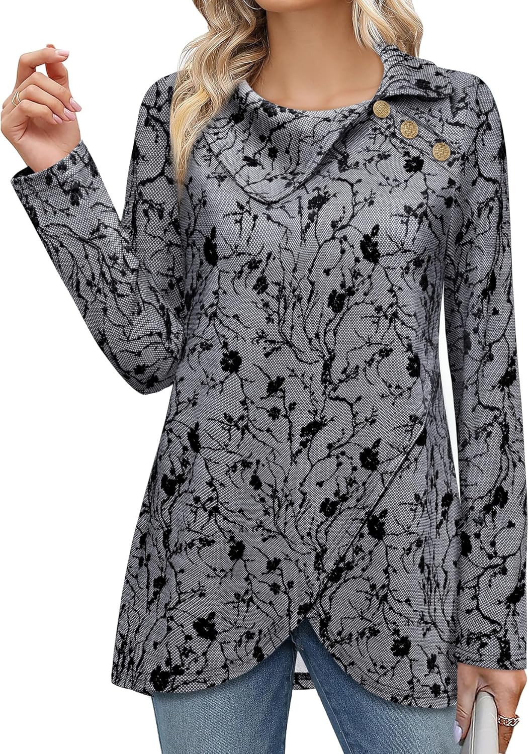 Bebonnie Women's Long Sleeve Lapel Neck Lightweight Sweatshirt Pullover Tunic Tops with Buttons