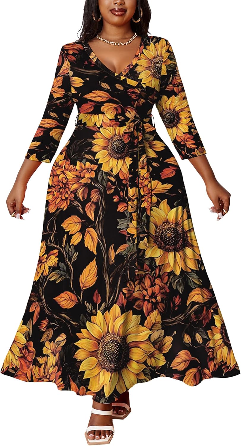 FANDEE Plus Size Maxi Dress for Women Summer, Casual 3/4 Sleeve V Neck Floral Flowy Long Dresses with Belt Pockets, XL- 5XL