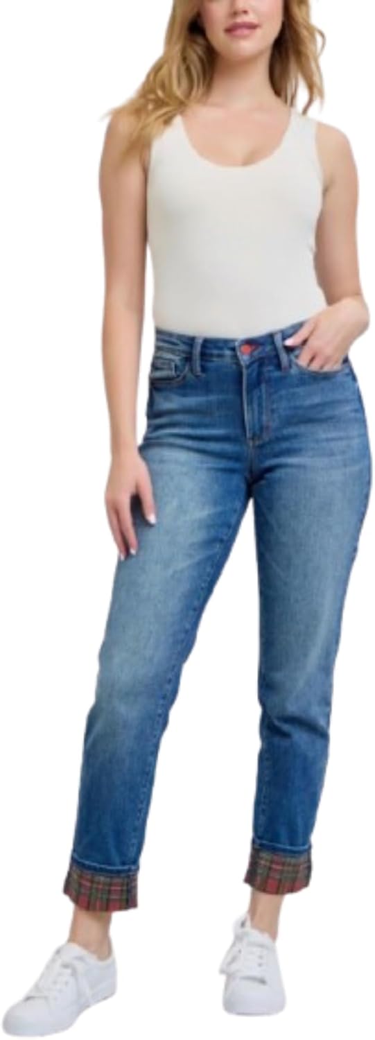 Judy-B Women's Casual Straight-Leg Jeans High-Waisted Plaid Print Cuff Denim Pants with Pockets Medium Blue