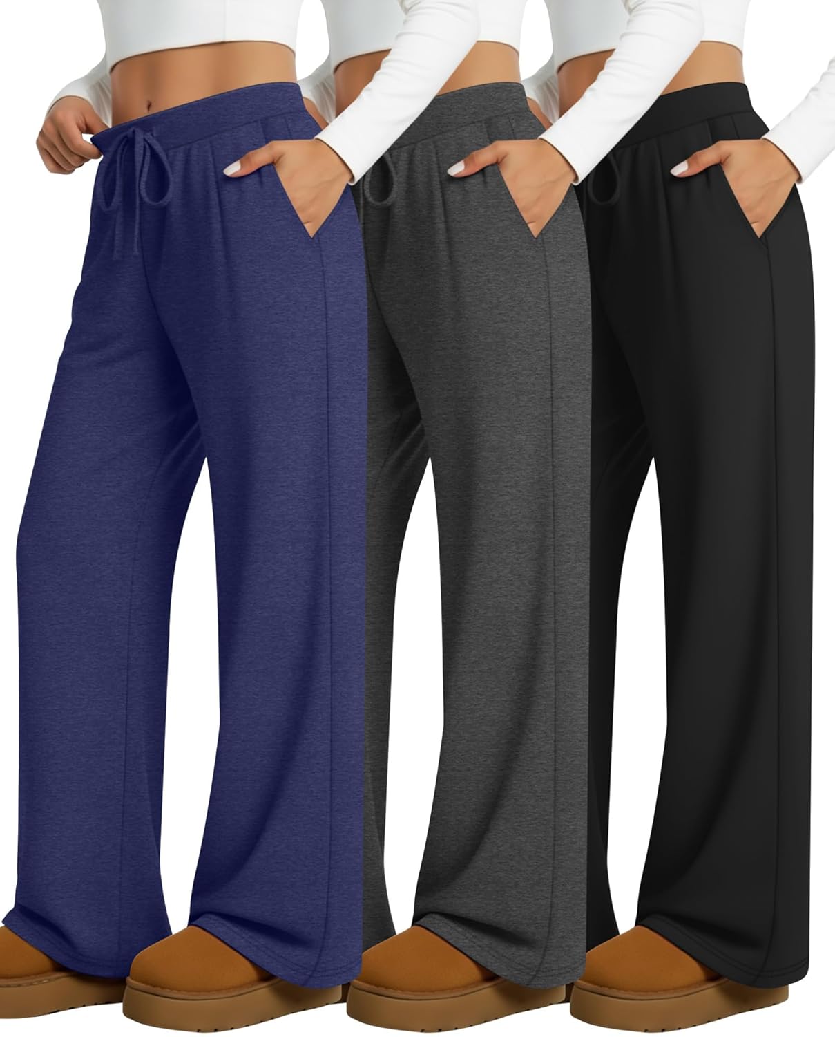3 Pack Women's Wide Leg Lounge Pants, Loose Drawstring Yoga Sweatpants with Pockets Casual Cozy Pajama Jogger Pants