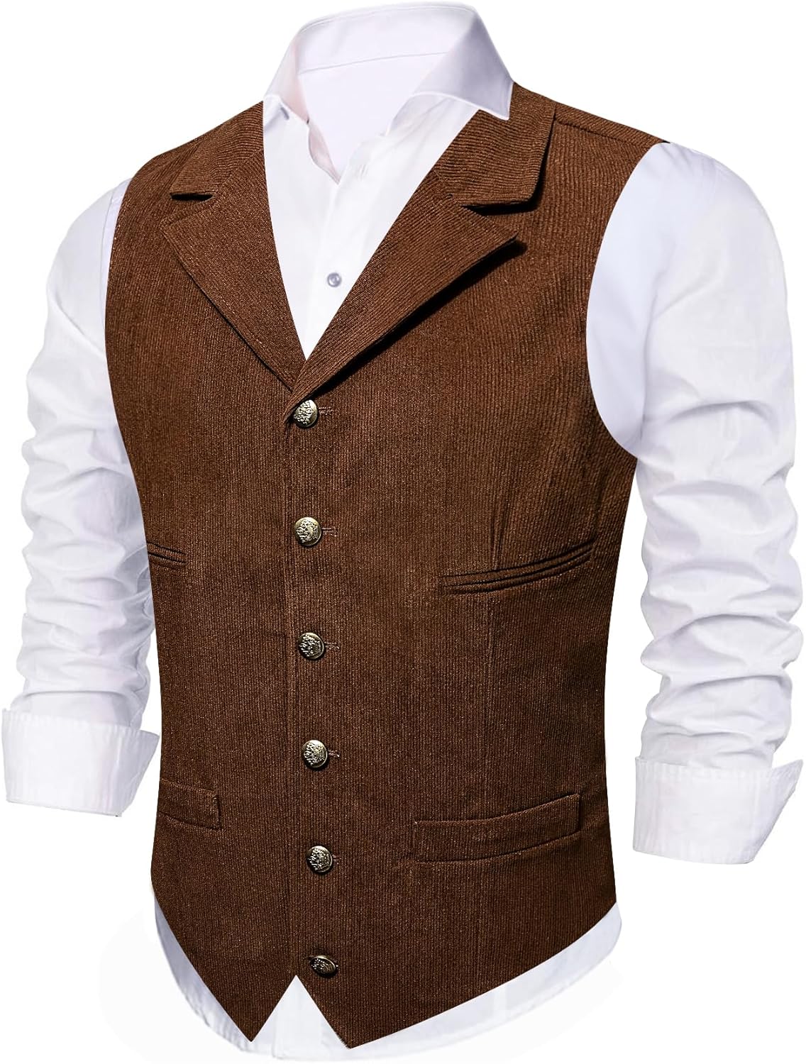 Barry.Wang Men's Corduroy Vest V-Neck Vintage Western Cowboy Waistcoat Sleeveless Jacket Slim Fit Casual Business Vests