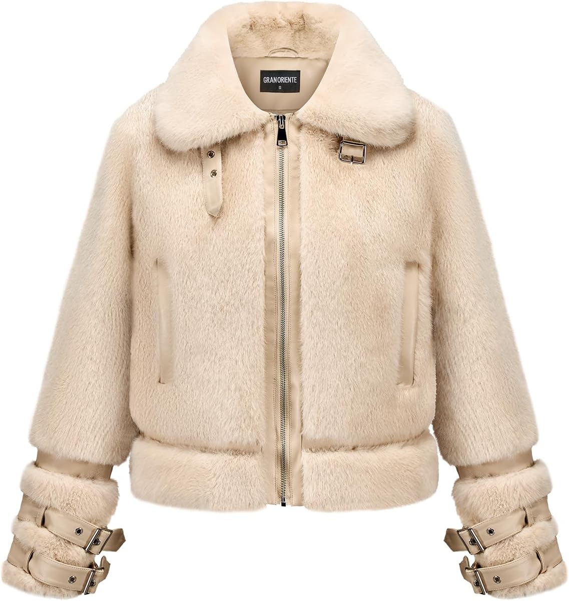 GRAN ORIENTE Womens Belted Winter Faux Fur Coats, Cropped Fuzzy Cuff Furry Zipper Up Warm Jackets Outwear