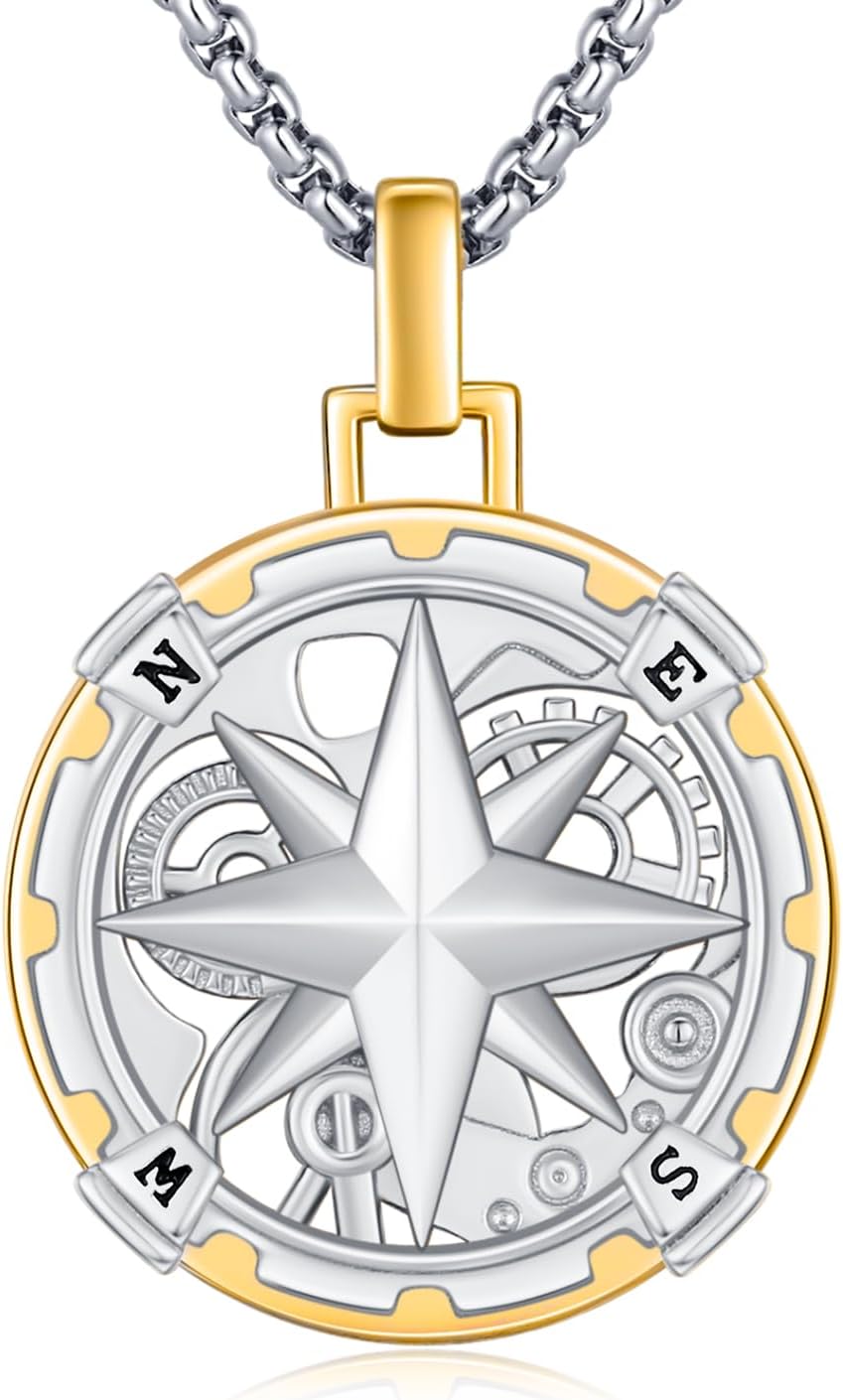 925 Sterling Silver Compass Necklace with Stainless Steel Rolo Chain 22"+2"