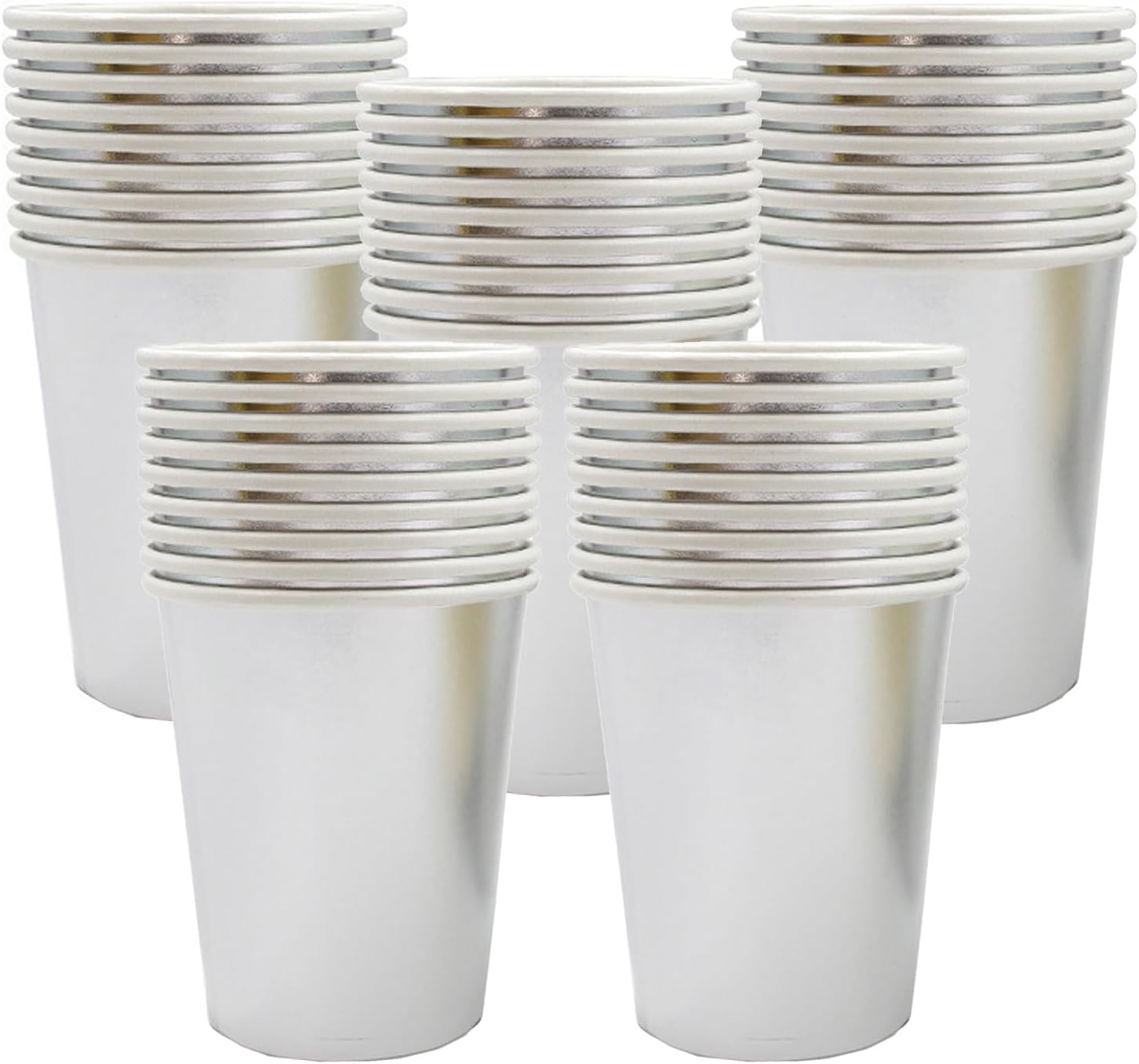 50 Pieces Disposable 9 oz Drinking Cups Metallic Paper Cups Party Drinks Cup for Hot Cold Drink, Tea, Coffee, Cocktail, Silver