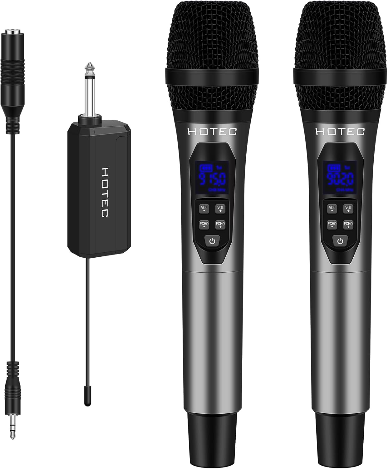 - Plug and Play with ECHO/Volume Control: Simplify your setup with Hotec's wireless mic set. Plug the mini receiver into the 1/4" mic input, turn on the mic system, and you're ready to go. Instantly adjust ECHO and volume using the microphone buttons to suit your needs.