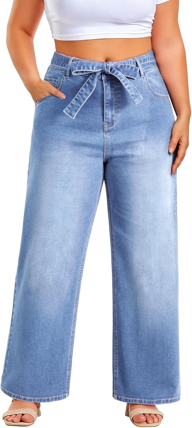 Eytino Plus Size Wide Leg Jeans for Women Elastic High Waist Stretchy Belted Denim Pants with Pockets(1X-5X)