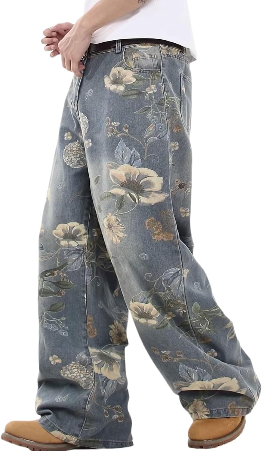 FantasyGears Y2k Baggy Jeans Men Flower Print Graphic Jeans Harajuku Wide Leg Boyfriend Denim Pants Streetwear