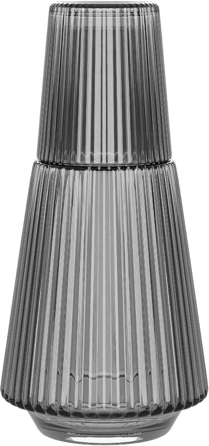 American Atelier 37 oz Vintage Bedside Water Carafe with Tumbler – 9.25" Ribbed Glass Pitcher with Cup Lid for Bedroom, Guest Room, Office, Vanity, Decorative & Practical Drinkware (Gray)