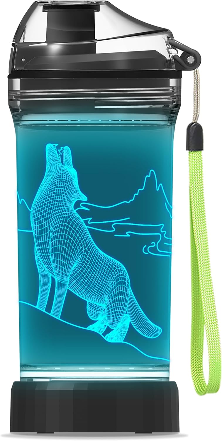 - Cool Design: Water bottle + night light + wolf pattern (3 IN 1).The light up water bottle is a combination of art and technology that creates an optical 3D illusion and challenge your mind. Choose from many fun themes: dinosaur, dog, horse, unicorns,train and more. This is a great gift idea, get it with the confidence that any family member or friend is sure to love and use it for years to come.