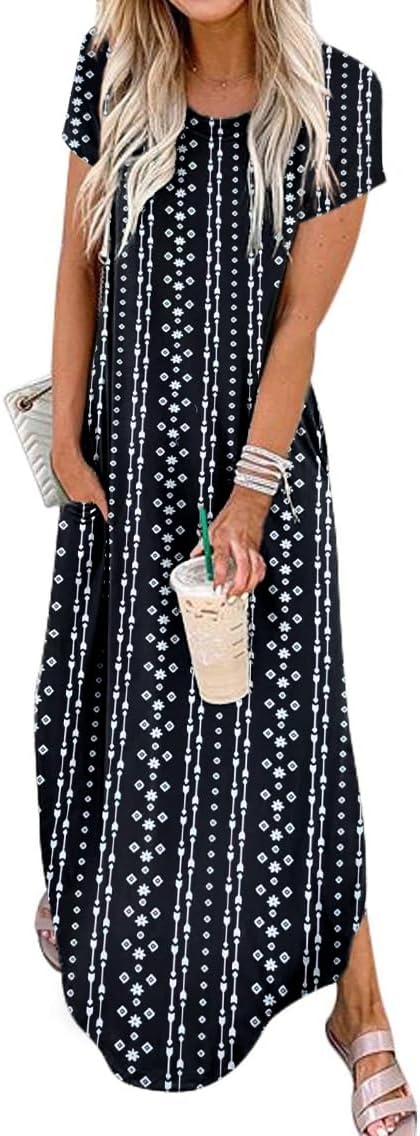Women Summer Long Sundress Crewneck Short Sleeve Maxi Dress 2026 Casual Loose Beach Dress with Pockets