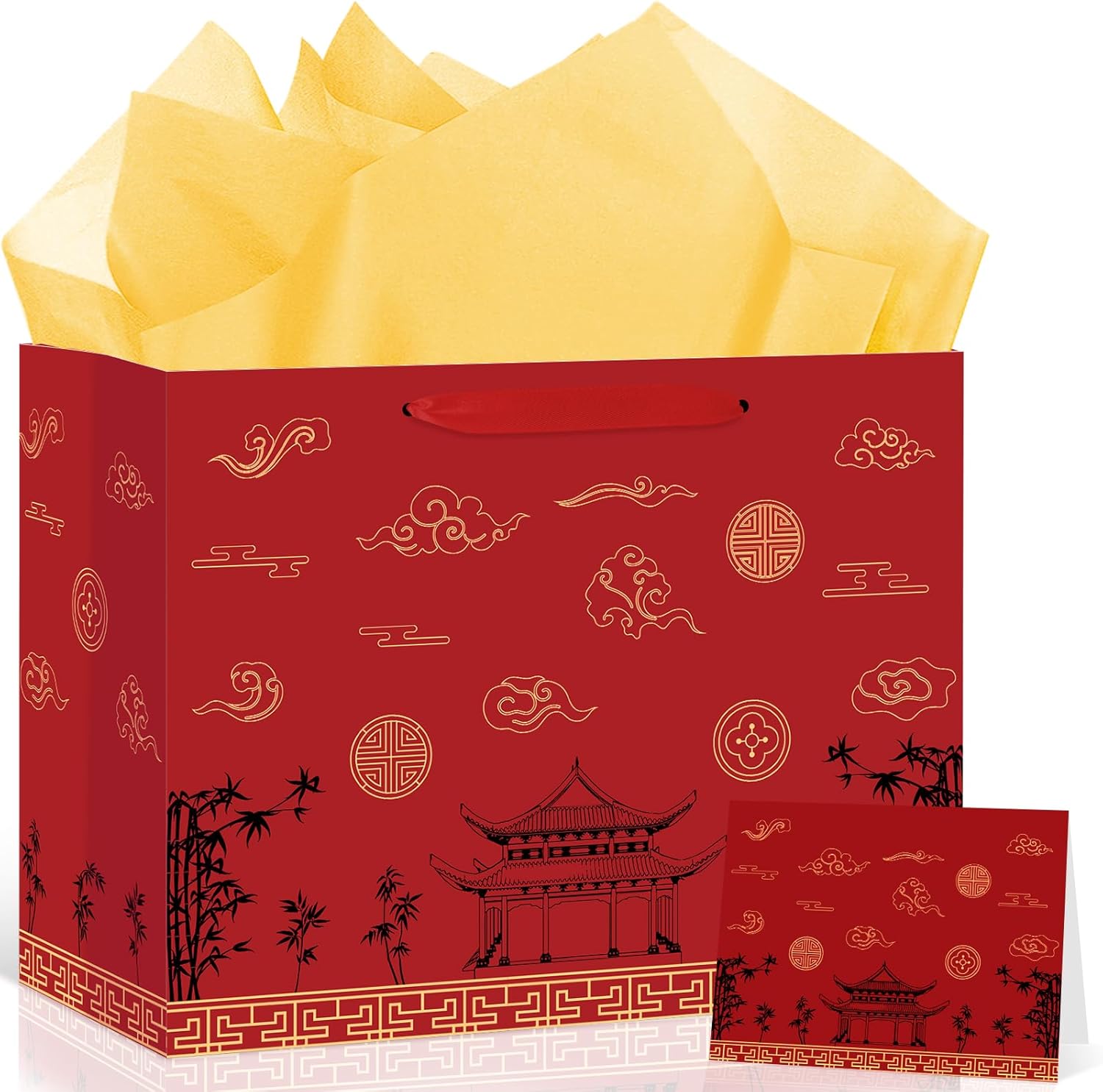 - Eye Catching Chinese Design:The gift bag and greeting card feature traditional Chinese patterns and motifs, exuding a sense of cultural richness and elegance. The vibrant red color, a symbol of good fortune in Chinese culture, makes this set stand out. It's perfect for those who want to add a touch of Chinese charm to their celebrations.