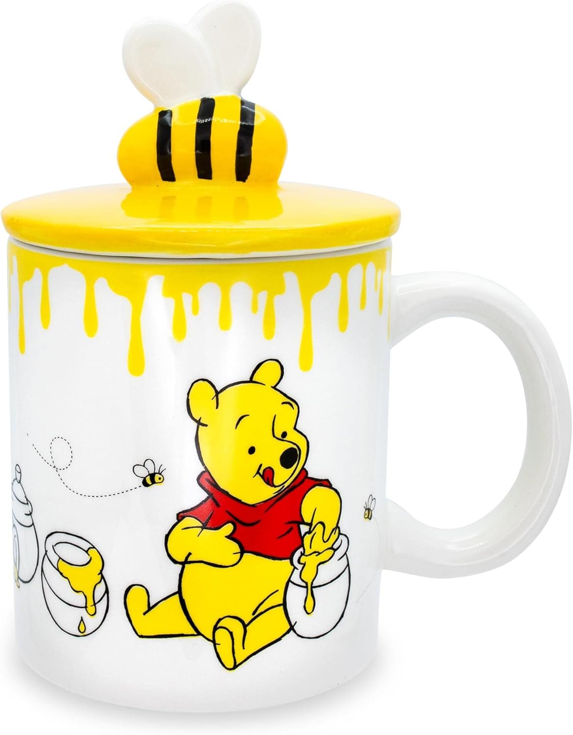 - SCULPTED HANDLE MUG: Our sculpted handle mug holds 18-ounces of your favorite beverage. This Winnie the Pooh 18oz. Ceramic Mug features Winnie the Pooh with his hand in his Hunny Jar and comes with a sculpted lid with a cute Bee Handle