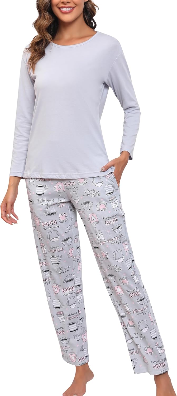 PNAEONG Women's Cotton Long-Sleeve Tops and Full-Length Pajama Set Two-Piece Pjs with Pockets SY008