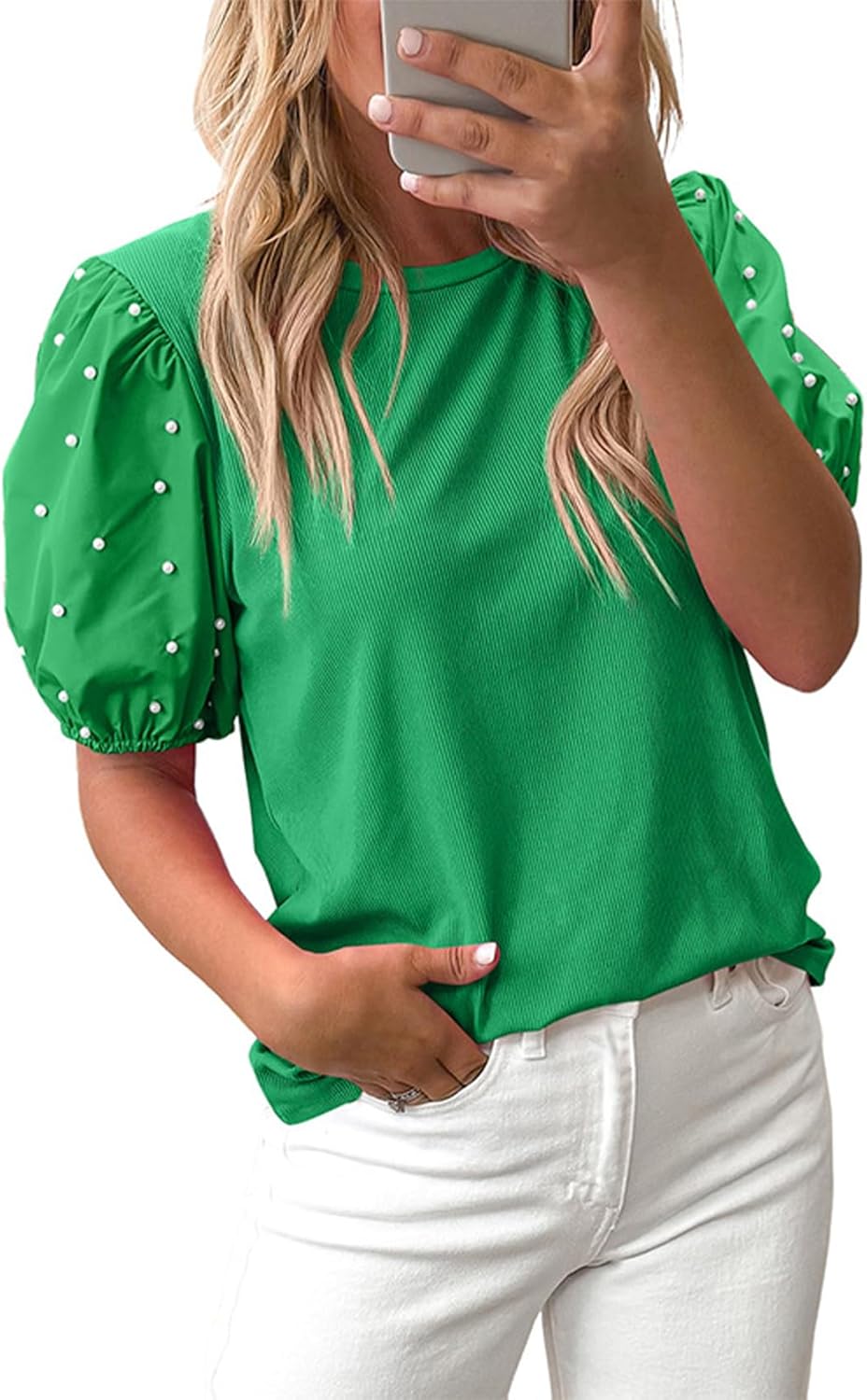 Chvity Puff Sleeve Tops for Women Summer Ribbed Knit Pearl Cute Tops Loose Fit Short Sleeve Crewneck Business Casual Outfits