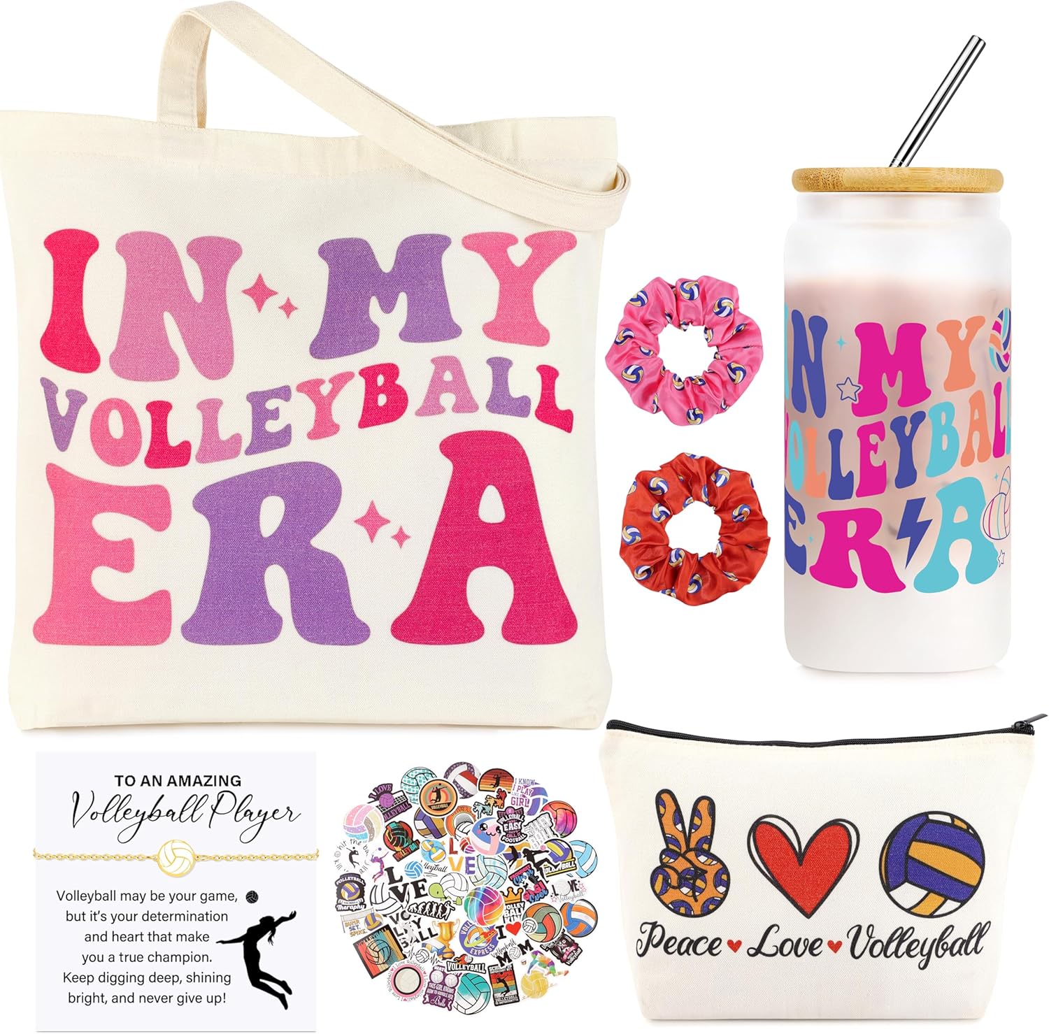 - Perfect Volleyball Gift Set for Girls: Includes a 16oz volleyball-themed glass cup, a cute makeup bag, a spacious tote bag, a dainty bracelet, 50 unique volleyball stickers, and 2 soft hairbands. A thoughtful and fun gift for teen girls, volleyball players, teammates, or fans of the sport