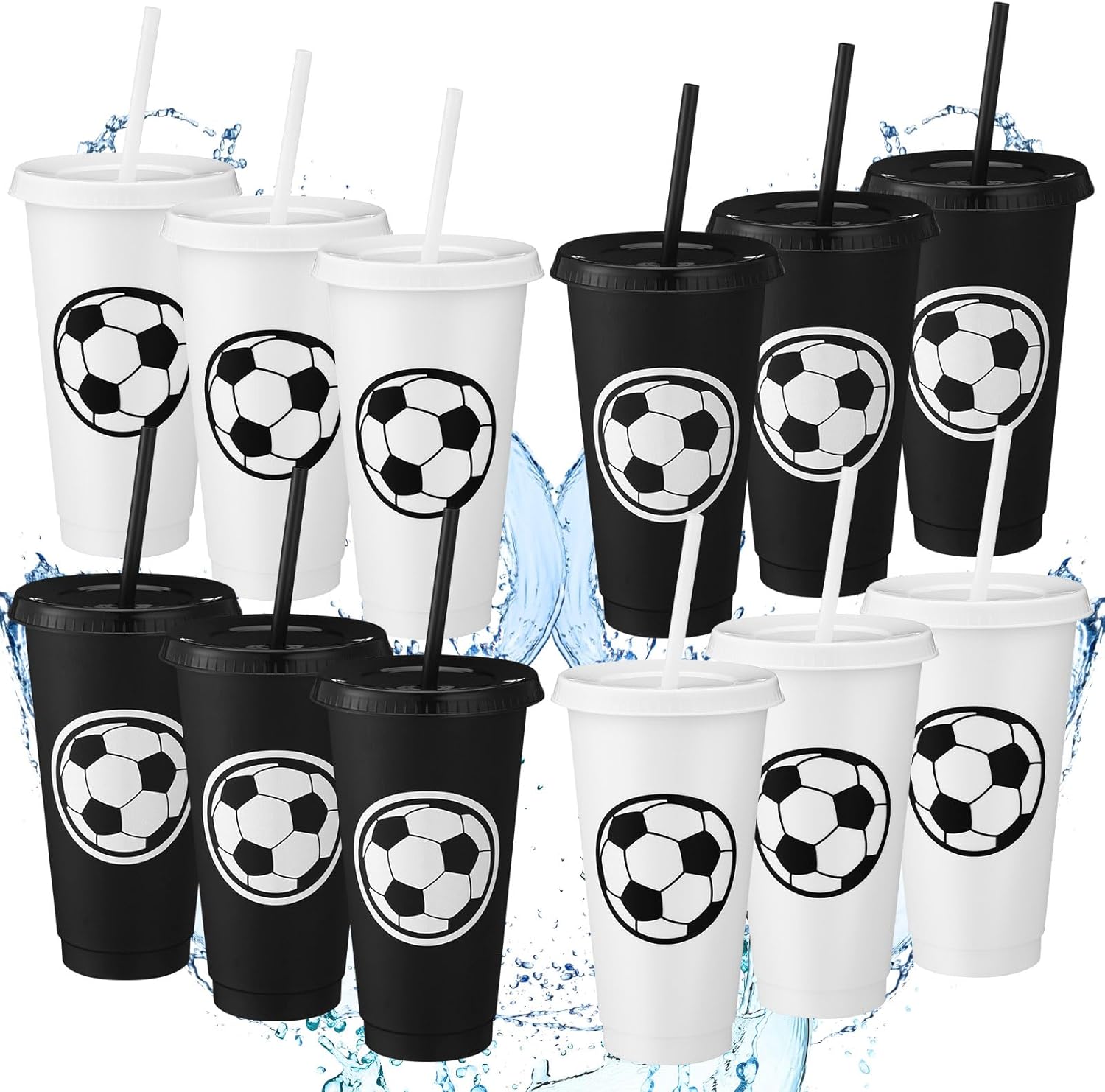 Domensi 12 Pcs Sport Soccer Plastic Cups with Lid and Straw 24 oz Reusable Plastic Cups Coffee Tumblers Gift for Fan Friend Guest Birthday Office Sport Party Supplies (Black,White)