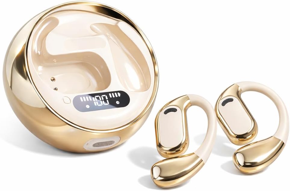 Open Ear Earbuds Wireless Earbuds Bluetooth 5.4, LED Display Bluetooth Earphone for Workout/Running, AI Noise Reduction Touch Controls, 72hr Playtime,Waterproof(Gold)