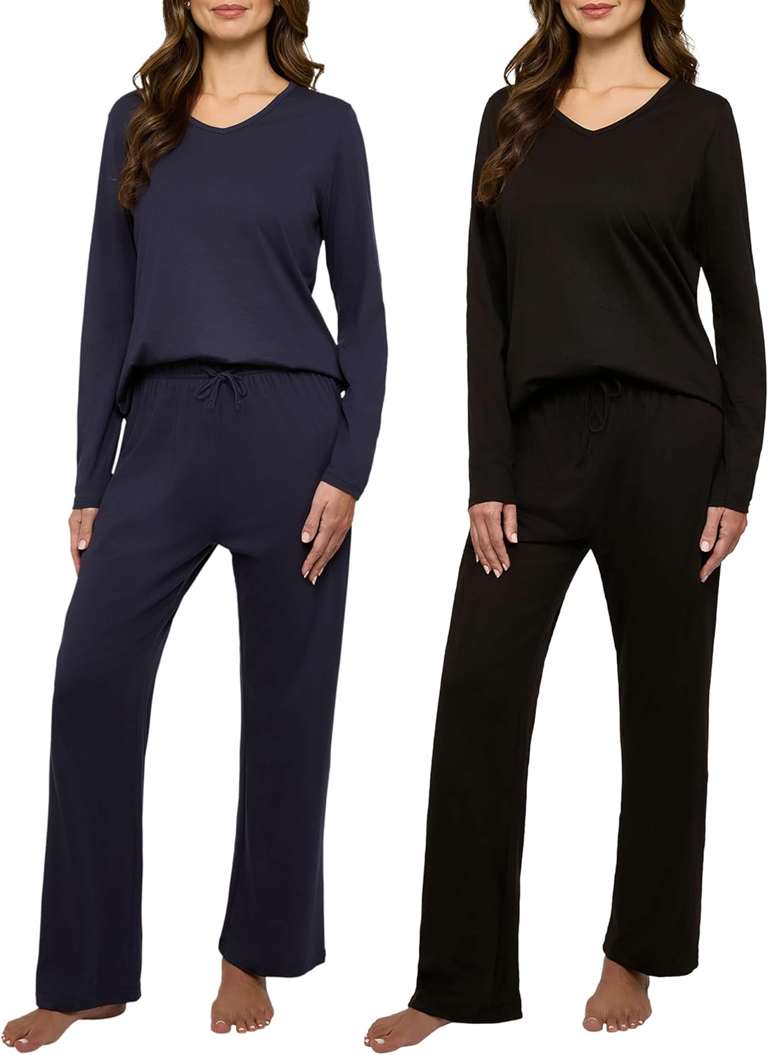 Real Essentials 2 Pack Women's Soft Cotton Long Sleeve Pajama Set with Pants - Lounge Sets for Women (Available In Plus)