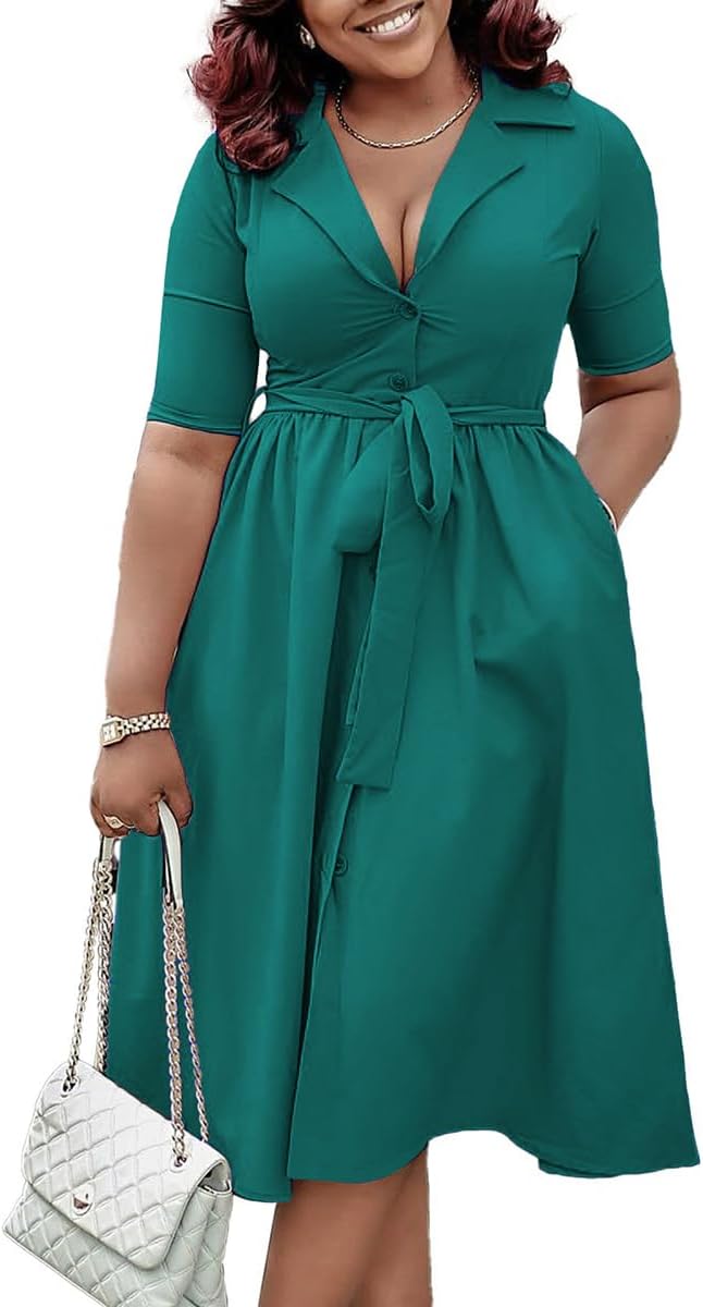BFFBABY Womens Plus Size Wrap V Neck Casual A Line Midi Dresses Short Sleeve Summer Swing Dress with Belt Pockets