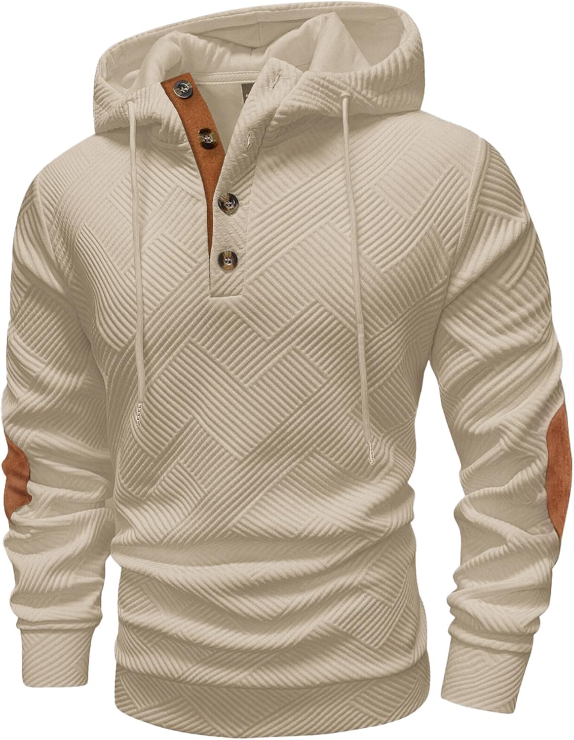 Mens Fashion Pullover Hoodies Long Sleeve Thermal Drawstring Button Texture Hooded Sweatshirt