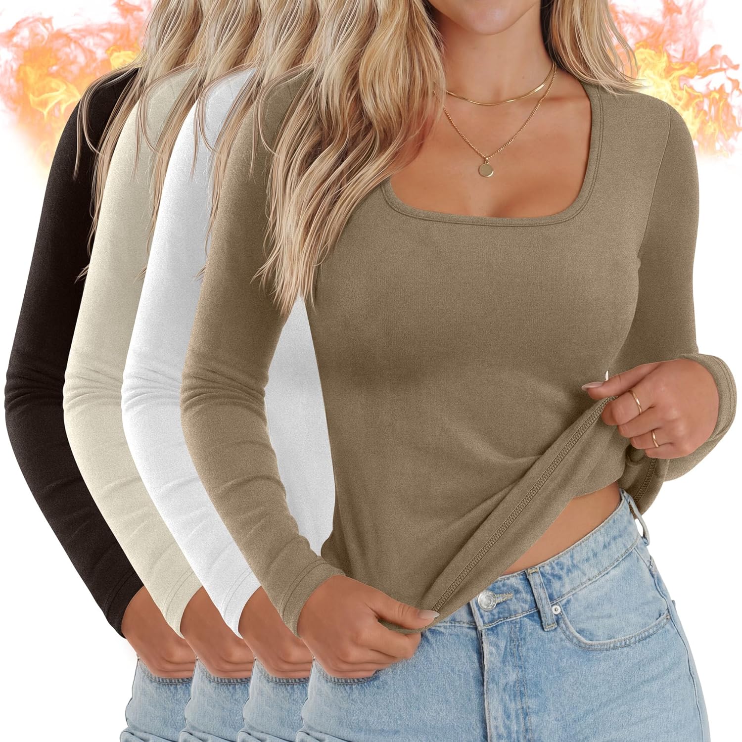 Huukeay 4 Pack Women's Thermal Long Sleeve Shirt Square Neck Fleece Slim Warm Winter Tops Casual Fashion Base Layer