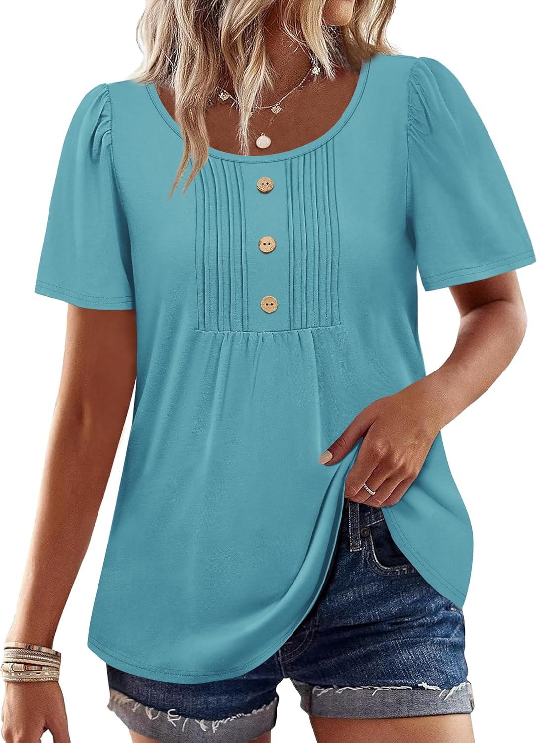 Womens Tops Dressy Casual Blouses Short Sleeve Shirts Plus Size Fashion Clothing Spring Summer Outfits Button Pleated Front