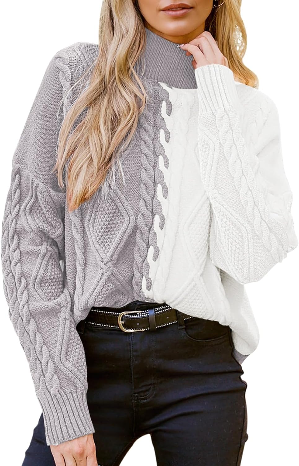 Pink Queen Women's Chunky Sweaters 2025 Fall Winter Long Sleeve Mock Neck Cable Knit Colorblock Pullover Jumper Tops