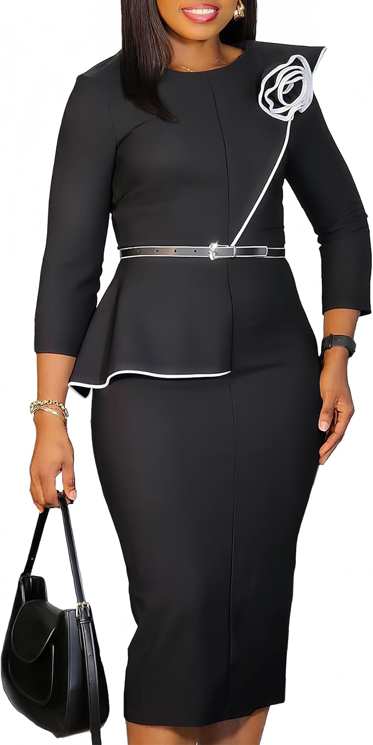 Elegant Church Dress for Women Midi Pencil Dresses Round Neck Business Casual Bodycon Outfits Work with Belt