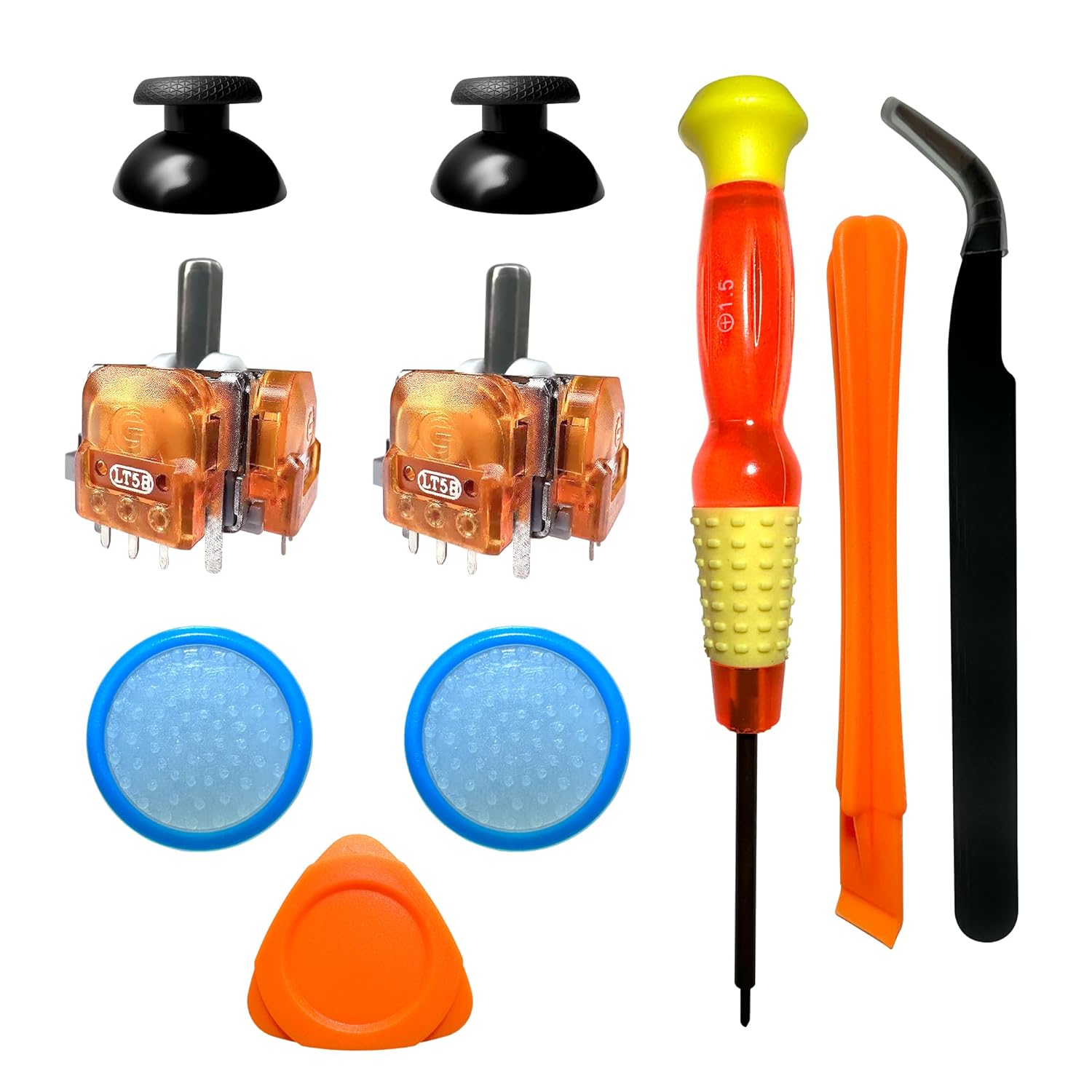 - 【10-In-1 Joysticks Replacement】 The PS5 Controller Stick Repair Kit Includes: 2 * TMR Joystick , 2 * Thumb Stick, 2*Thumbsticks Silicone Cap,1 * Tweezers, 1 * Triangular, 1 * Pry Bar, 1 * Crossed Screwdriver. Warm Tips:You also need a soldering tool which isn‘t included in the kit.