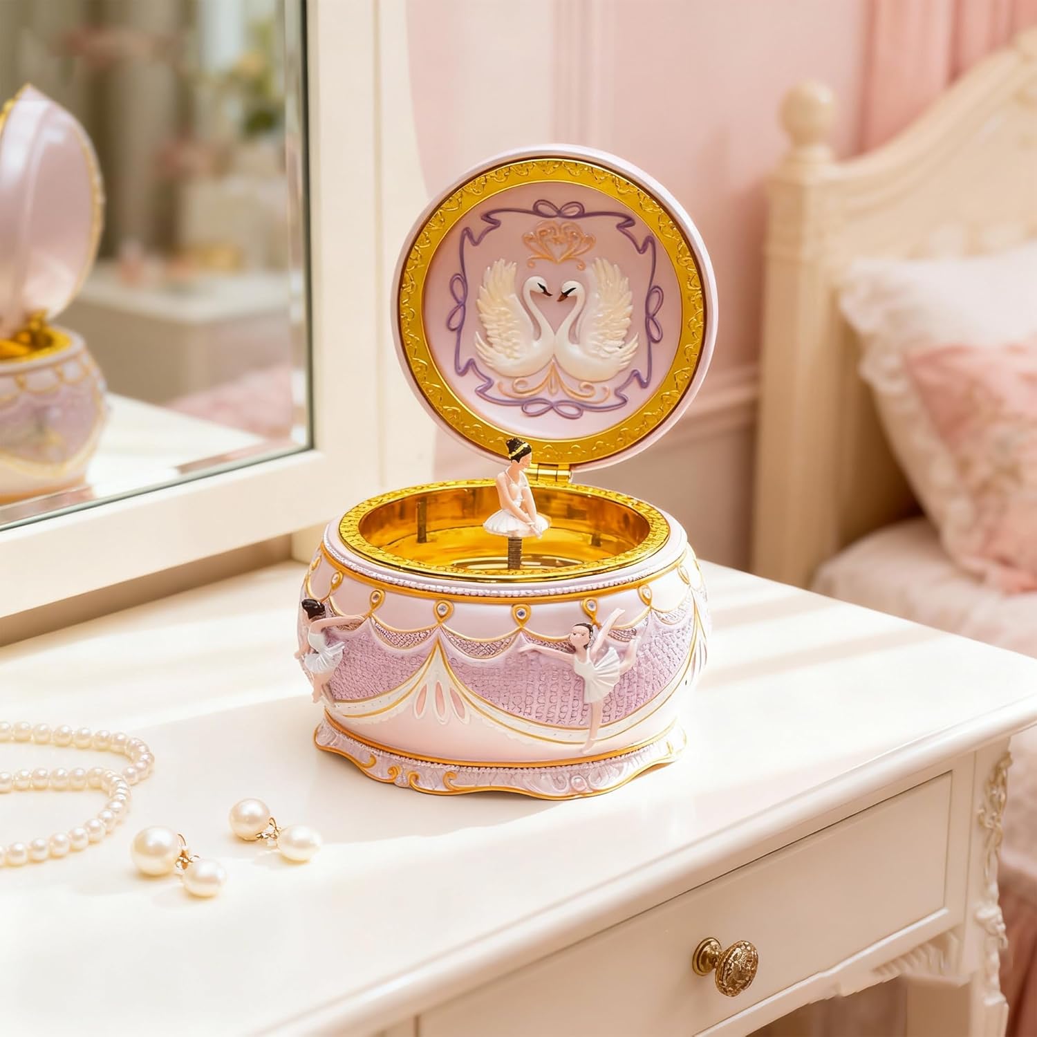 - BALLERINA GIRL MUSICAL BOX: This beautiful ballerina music box is elegant in texture and has a top quality feel, Made of high quality synthetic resin with metal movement. The pink ballerina girl and white swan around the music box body are nicely detailed by hand painting,