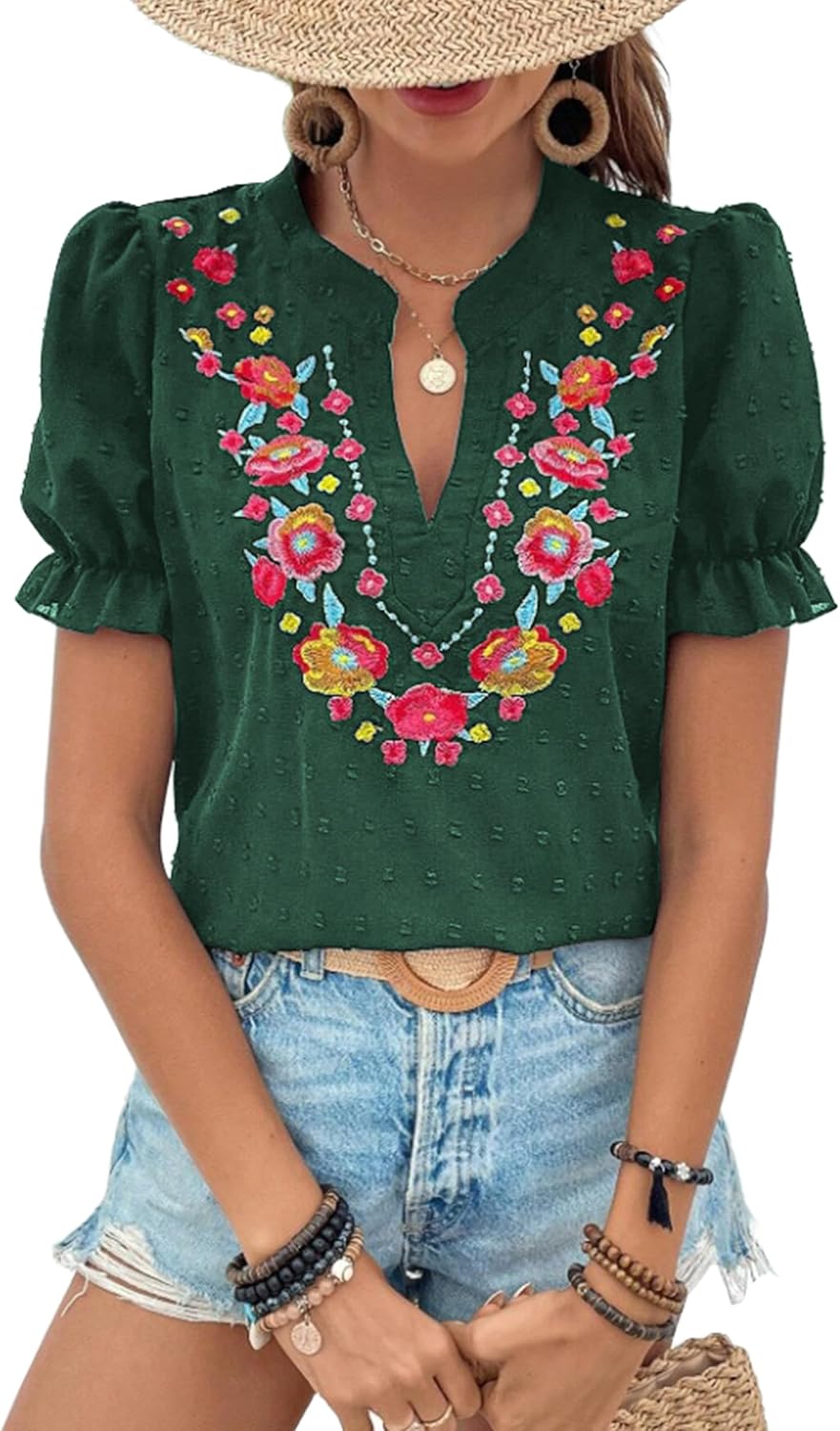 ZILIN Women's Casual Floral Embroidered V Neck Boho Short Puff Sleeve Shirts Loose Summer Blouses Tops Fashion Clothes 2026