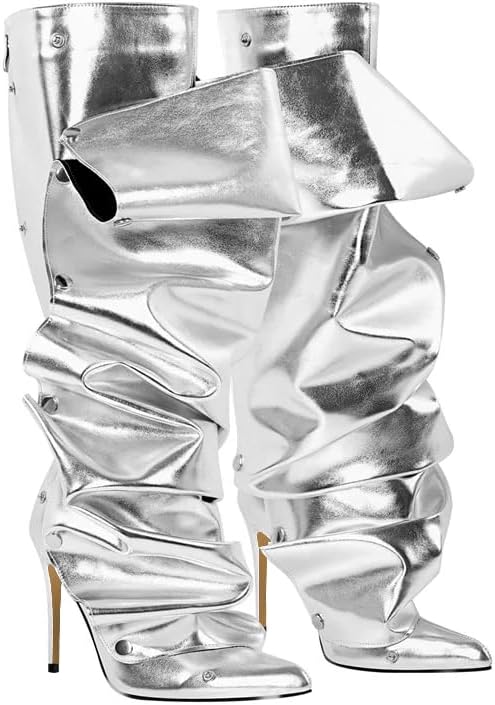 Women's Silver Knee High Boots - Sexy Stiletto Heel Pointed Toe Booties - Trendy, Edgy - All Seasons - Casual - Women's Fashion Boots
