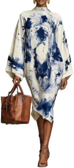 OSCORP Women’s Turtleneck Maxi Dresses with Paisley Abstract Ethnic Geometric Prints Bell Sleeve Loose Fit Elegant Style