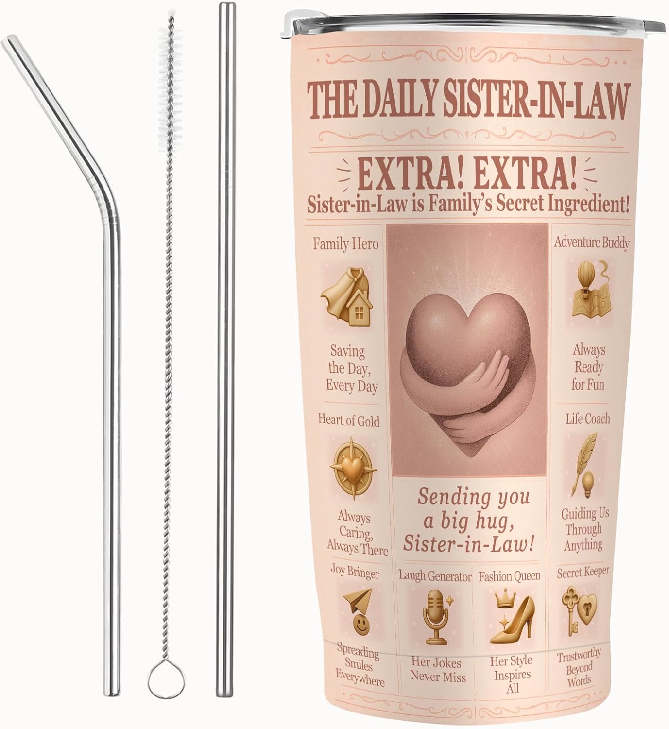 Sister-in-Law Gifts 20 oz Tumbler – Pink Retro Vintage Headline Travel Cup with Lid, Sentimental Bonus Sister Present for Birthday, Christmas, Mother’s Day, Wedding