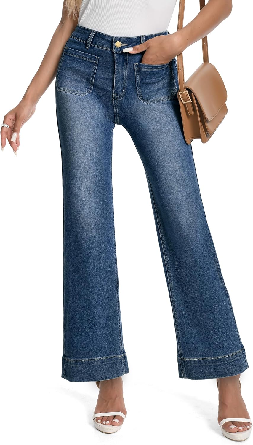 Tapata Women's 24/26 Petite Regular Wide Leg Jeans High Waisted Flare Stretchy Cropped Denim Pants Trendy Baggy Pockets
