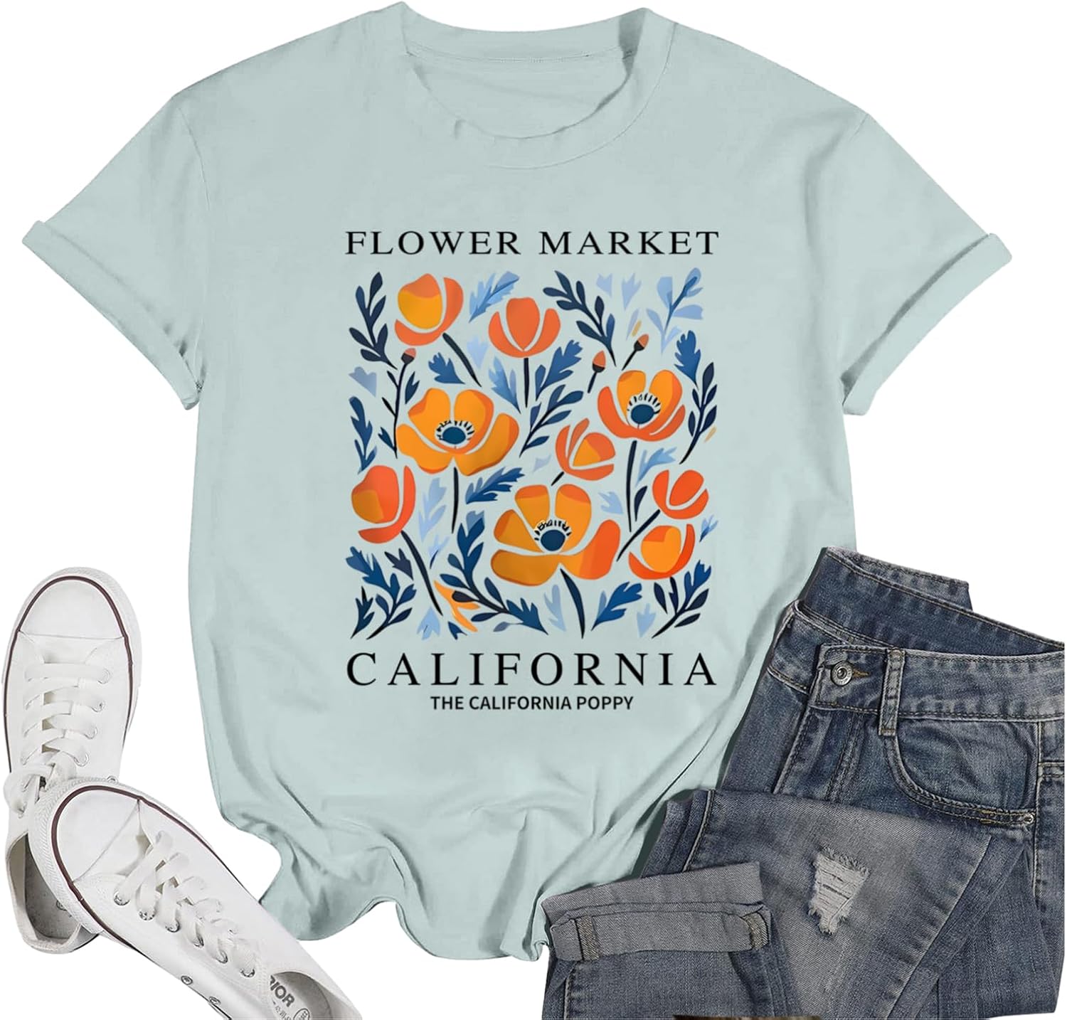 California Poppy Shirt Flower Boho Aesthetic Floral Shirts for Women Vintage Graphic Tees Wildflower Shirt Casual Top