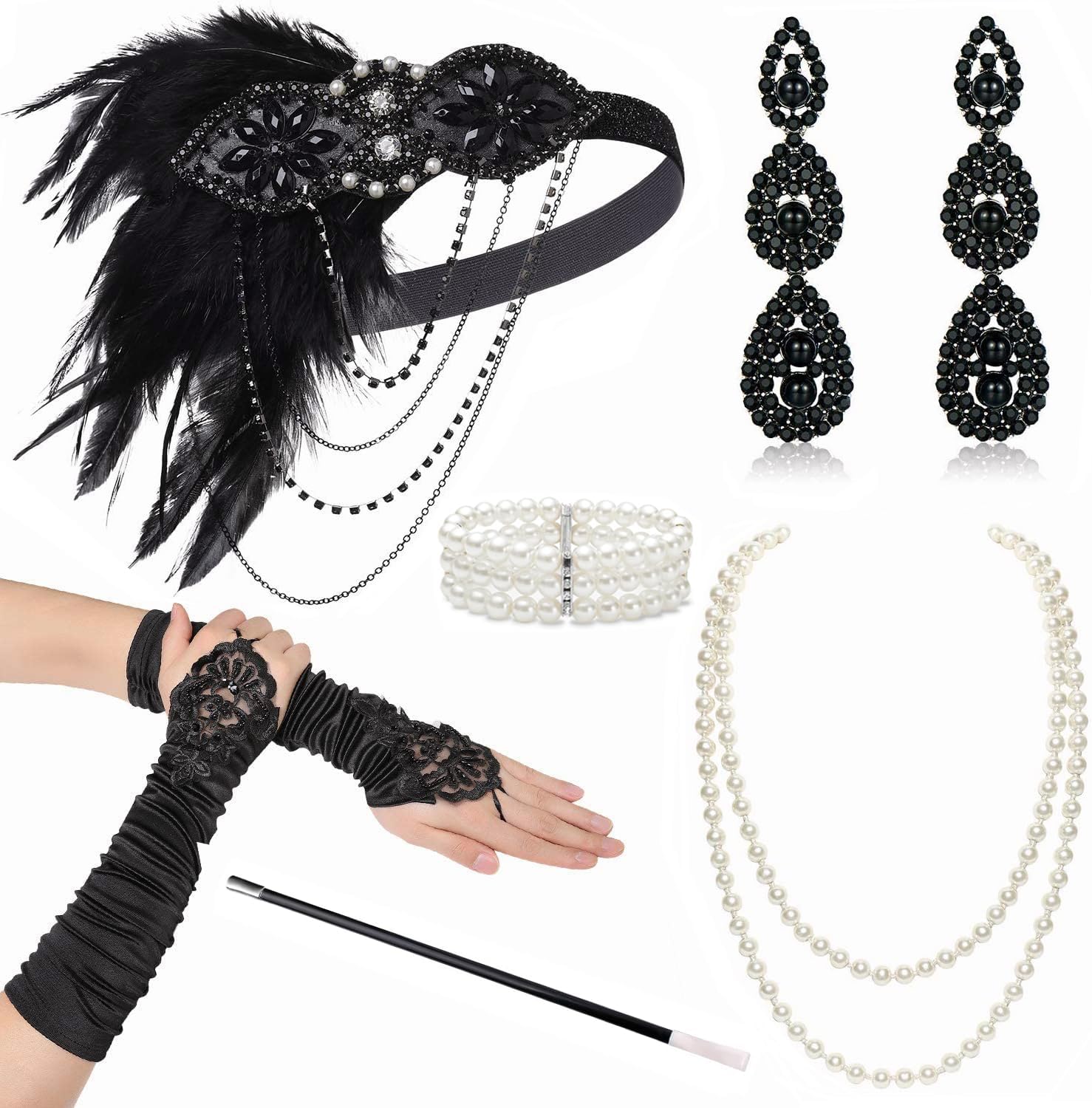 BABEYOND 1920s Flapper Accessories Gatsby Costume Accessories Set 20s Flapper Headband Pearl Necklace Gloves Plastic Holder