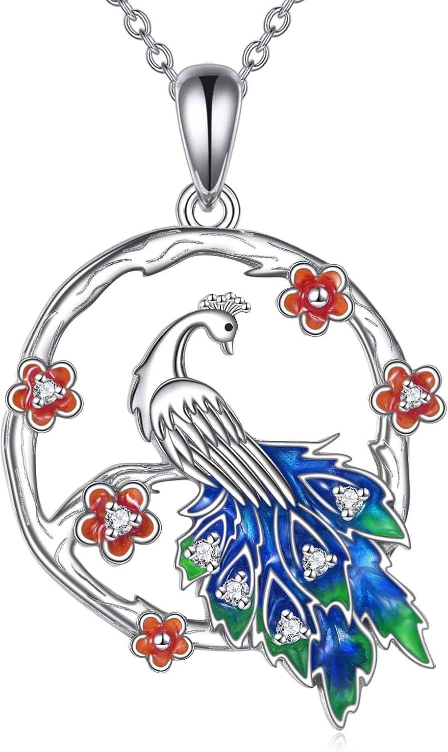 Diamond Peacock Necklace for Women 925 Sterling Silver Colored Peacock Pendant Necklace Cute Bird Animal Jewelry Gifts for Mom Wife Sister Friend Christmas Birthday,18+2 inch