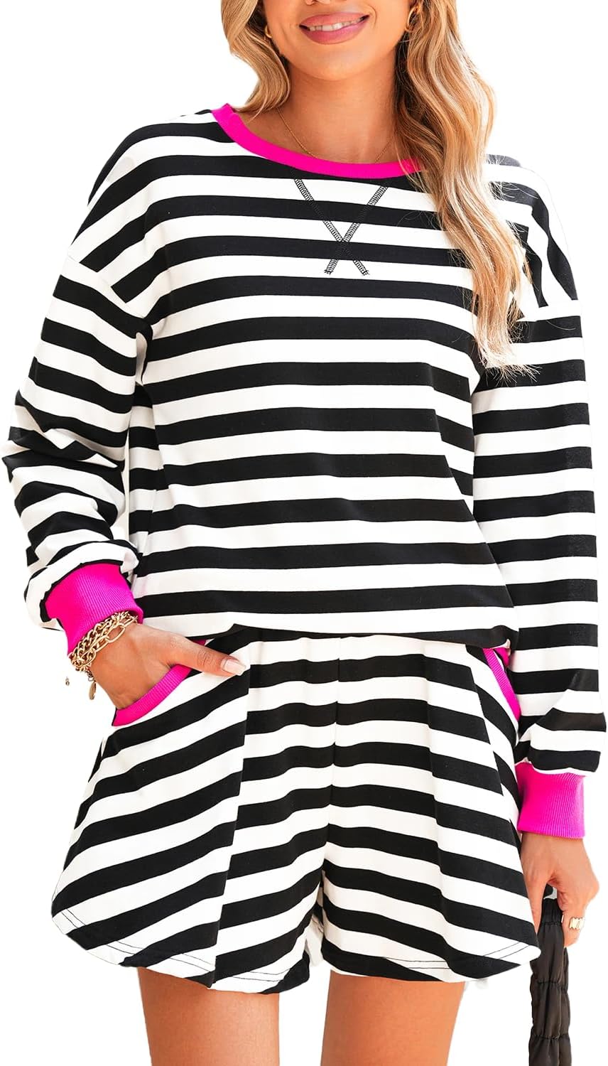 Womens 2 Piece Outfits Striped Sweatshirt Long Sleeve Pullover Top and Shorts Matching Lounge Sets