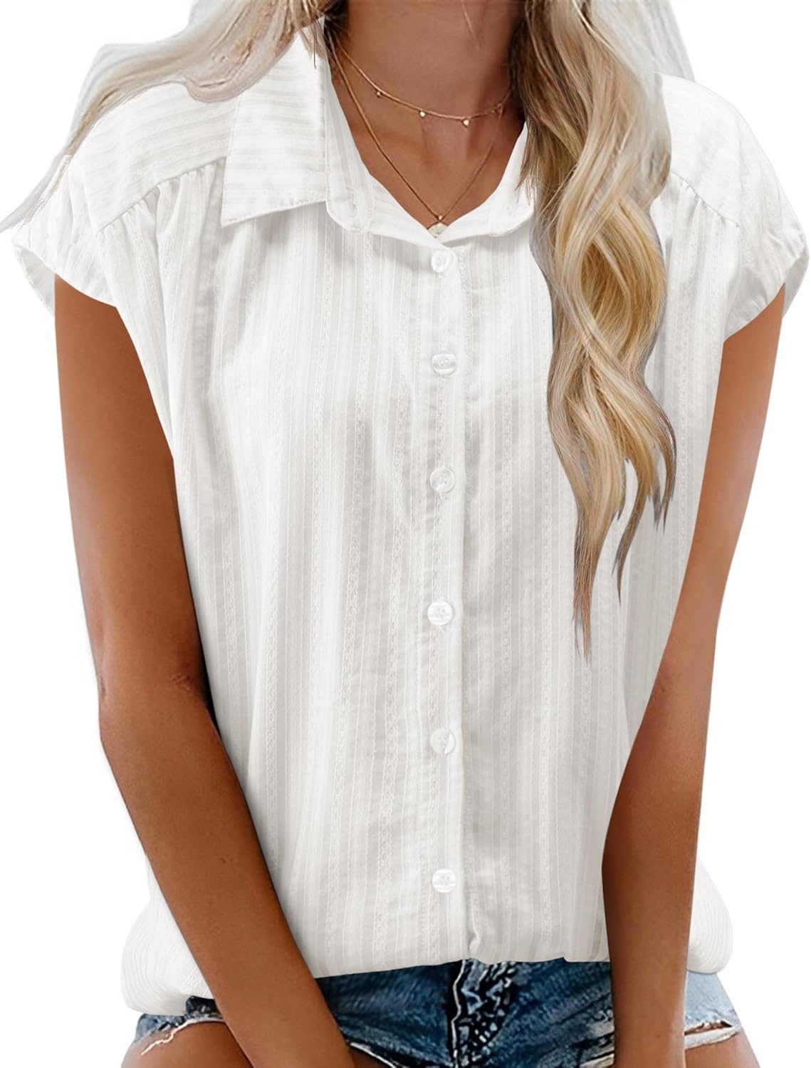 LOMON Womens Button Down Shirts Short Cap Sleeve Summer Cotton V Neck Collared Stripes Blouses Casual Plaid Tops